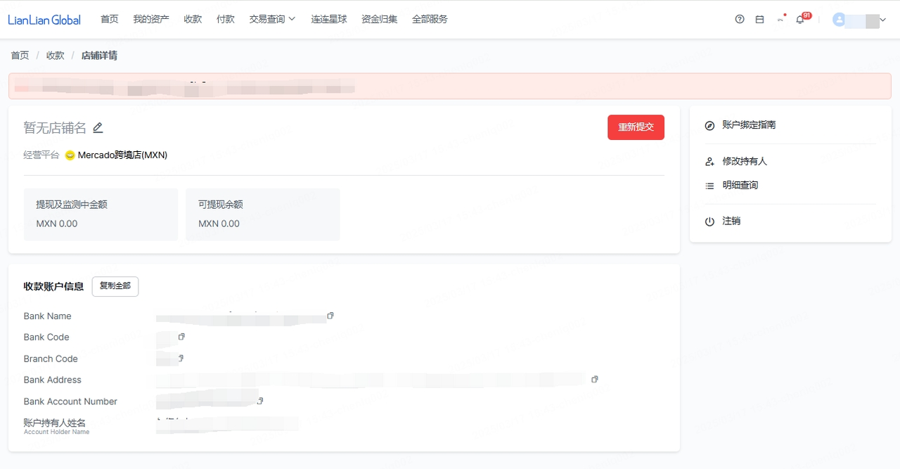 2、若美客多店铺是海外仓模式,可以绑定MXN币种的卡,但需要先绑定LL的USD币种卡,再刷新后台就可以看到绑定本土银行入口,建议周二、周三操作。