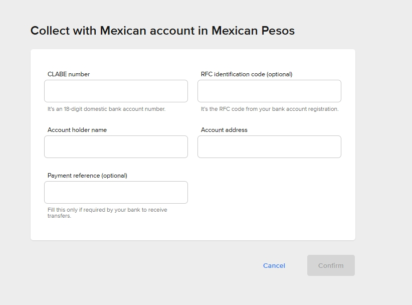 RFC identification code:提供与收款卡号账户主体一致的RFC税号(如有选填)