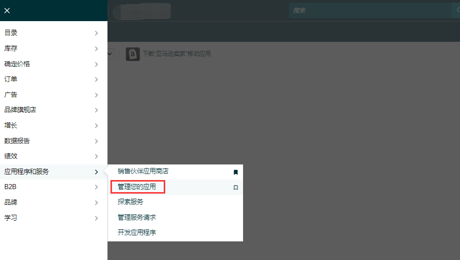 1、登录亚马逊商家后台,点击导航菜单【应用程序和服务】 – 【管理您的应用】(老版页面菜单路径为 【合作伙伴网络】-【管理您的应用】)