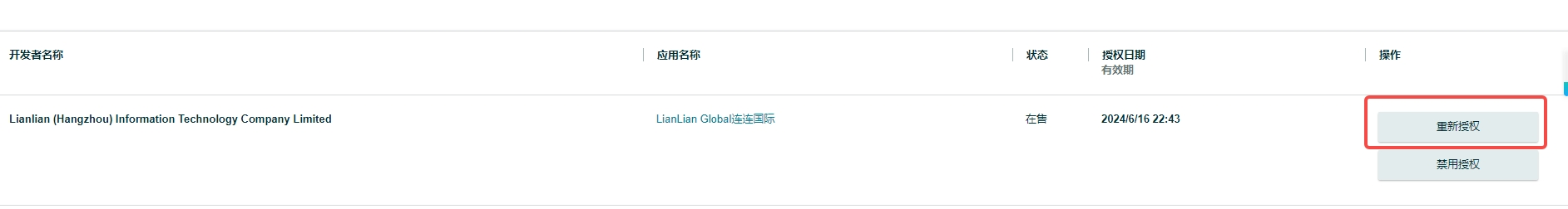 2、在LianLian Global应用栏最右侧,点击【重新授权】按钮