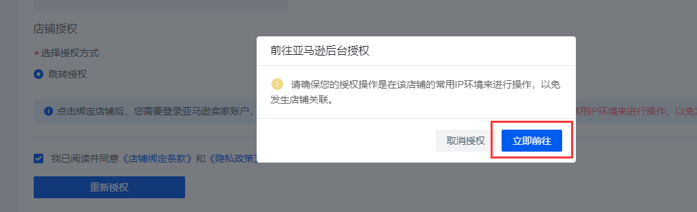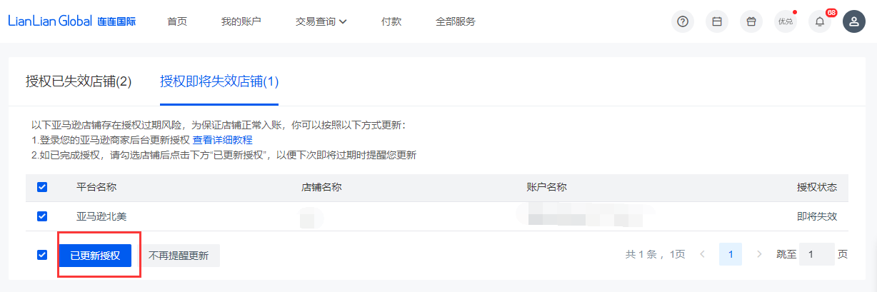 注意点:如完成上述操作后,再进到连连店铺详情页,还是看到授权即将过期的提醒,是需要您手动在连连页面上点击“我已更新授权”,点击后便不会有即将过期提醒。