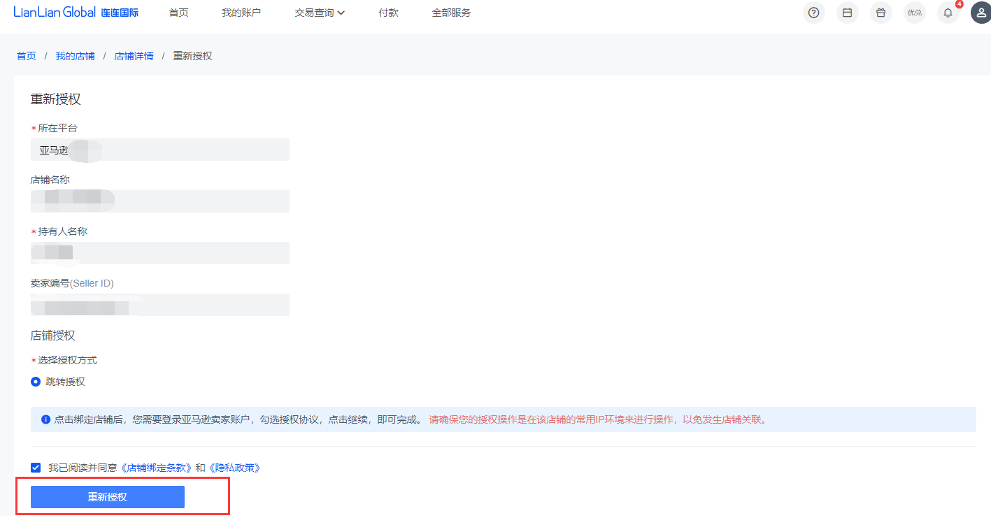 1、连连后台店铺详情页,点击【重新授权】