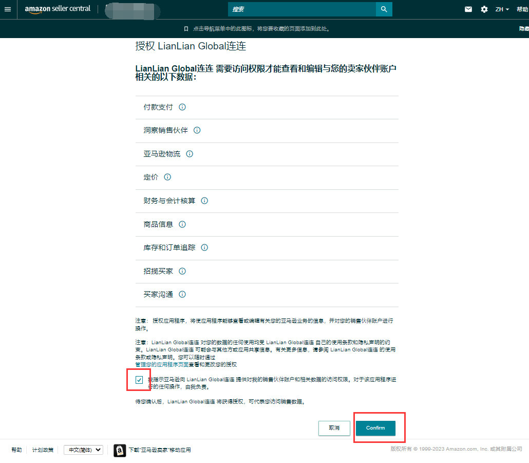 3、跳转亚马逊后台登录后,勾选方框,点击右下角【Confirm】,跳转回连连后台完成重新授权