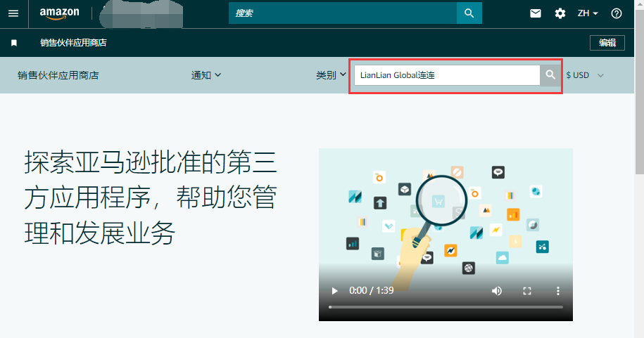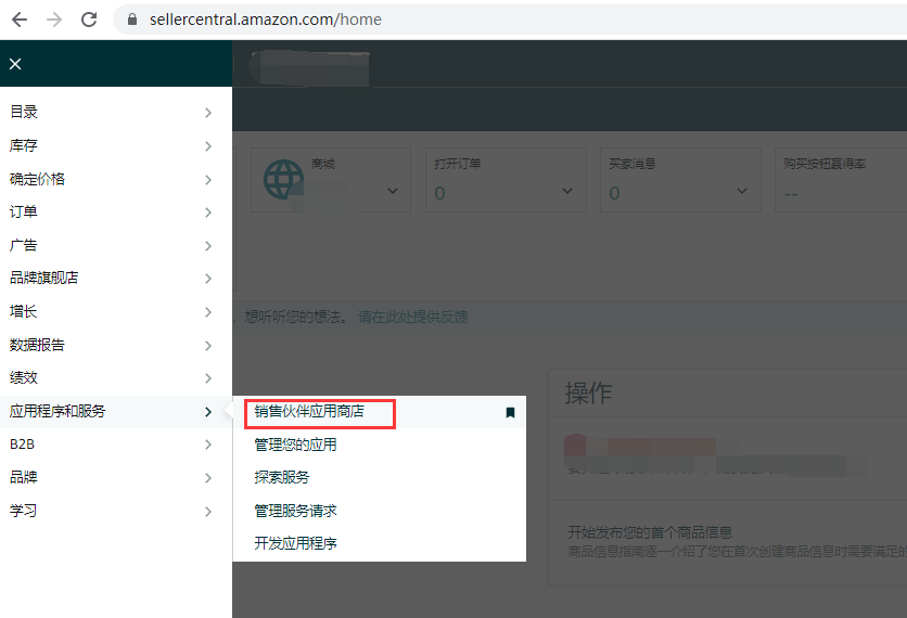 1、登录亚马逊商家后台,点击导航菜单【应用程序和服务】 – 【销售伙伴应用商店】(老版页面菜单路径为 【合作伙伴网络】-【查找应用程序和服务】)