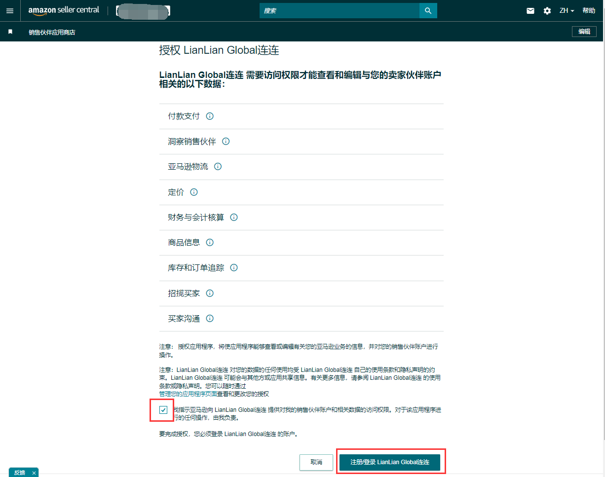 方法(1):可以通过连连用户站跳转到亚马逊后台进行更新授权