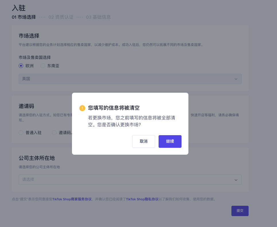 若切换市场,所有已填信息将被清空。