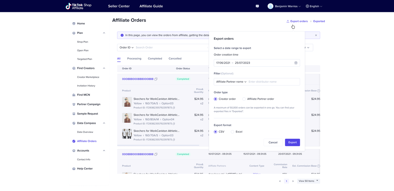 订单导出: