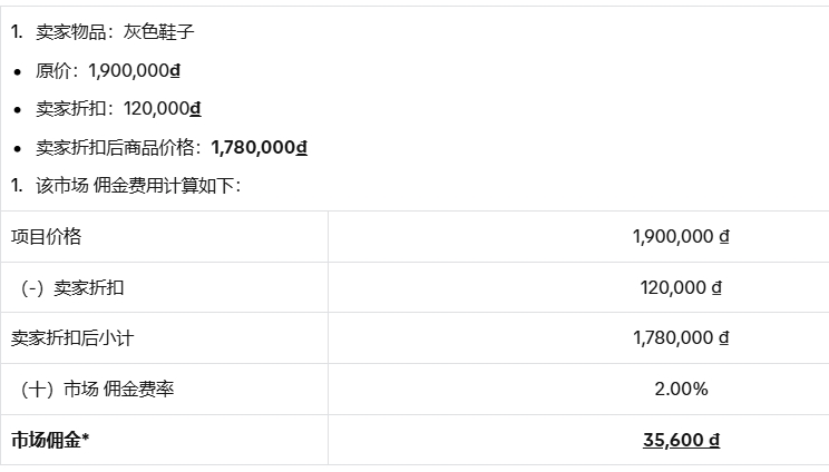 *注意:市场佣金包含越南税费。如果您是越南的税务注册组织,并且您的税法已提供给TikTokShop并由其验证,TikTokShop将仅收取不包括税费的金额。欲了解更多信息,请访问我们的功能指南此处以了解越南的税务计算说明。