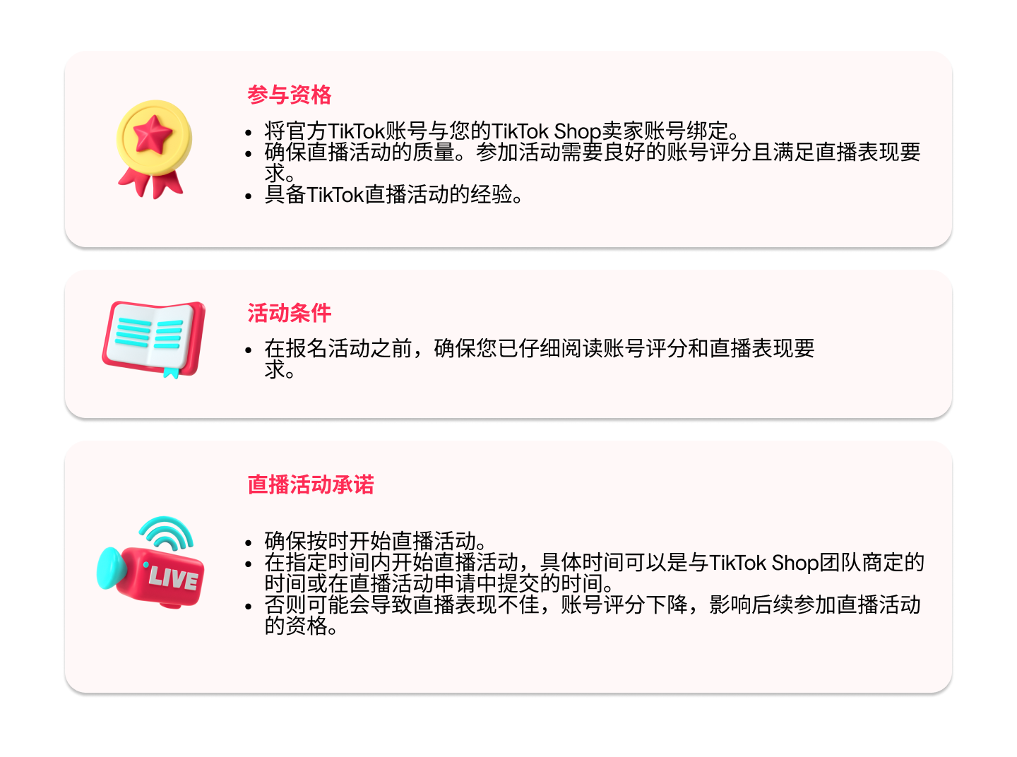 在活动详情页面,选择要求,查看活动的资格标准,例如账号和直播等级要求。