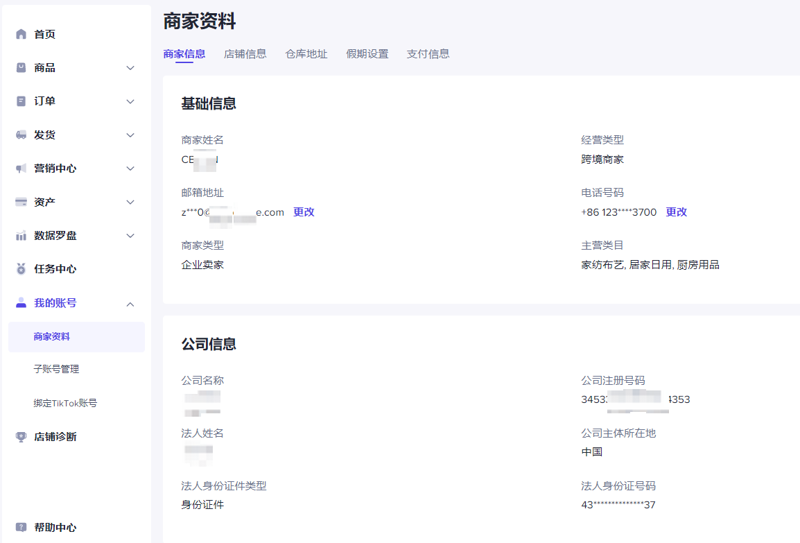 公司信息,包含公司主体、法人信息等,注:信息内容和商家注册时的信息保持一致,不支持修改