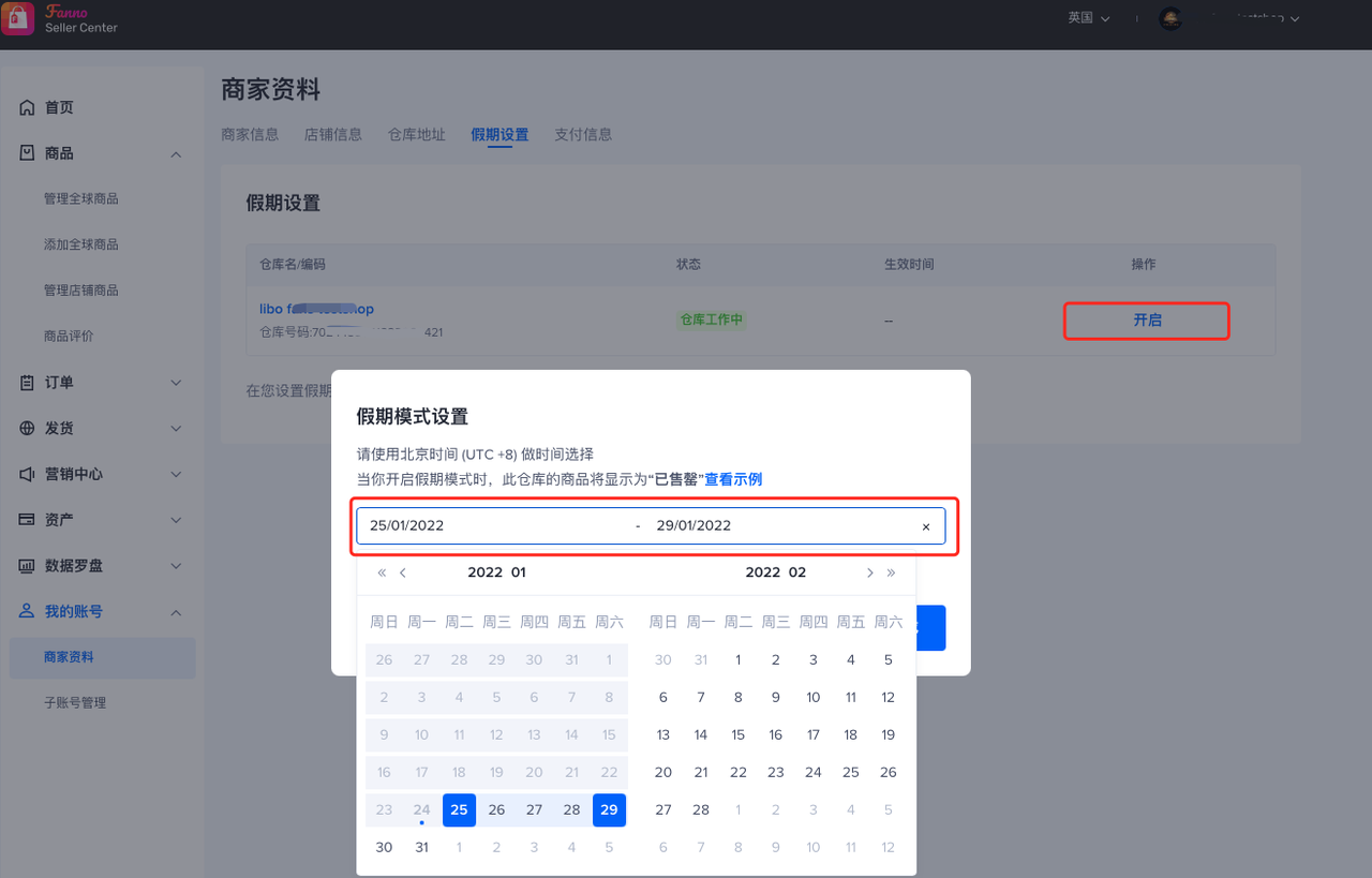 选择需休假的仓库,点击“开启”