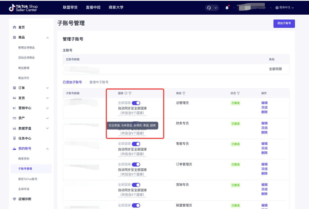 管理子账号:支持添加、移除、编辑子账号,并给不同子账号设置不同的查看权限;支持一键打开"全部国家"按钮获取全部国家权限,也支持单独选择某部分国家