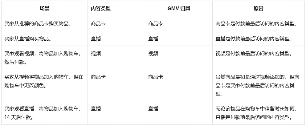 卖家和达人理解新GMV规则有助于理解TikTok Shop链路。这些示例旨在说明内容类型对GMV的贡献方式。
