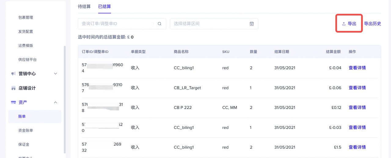 订单详情将以excel形式导出,最多支持导出连续90天账单。