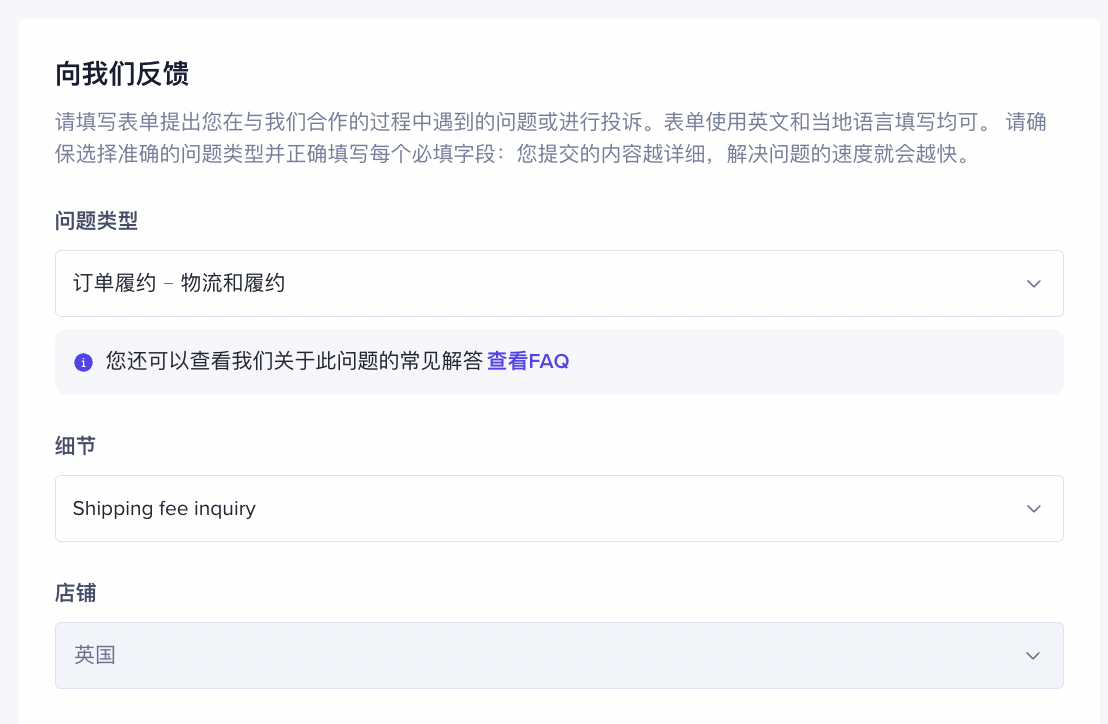 2.如配置无误,发起工单,选择问题类型【订单履约-物流和履约】&详情【shipping fee inquiry】,并提供同款商品在电子秤称重照片测量的照片