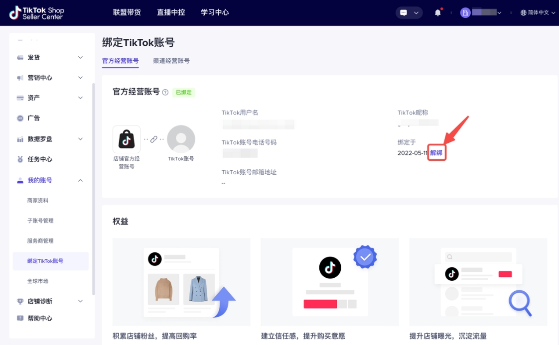 登陆TikTok Shop 商家中心,进入“我的账号”中的“绑定TikTok账号”界面,在“官方经营账号”中点击“解绑”解除官方账号与店铺的绑定。