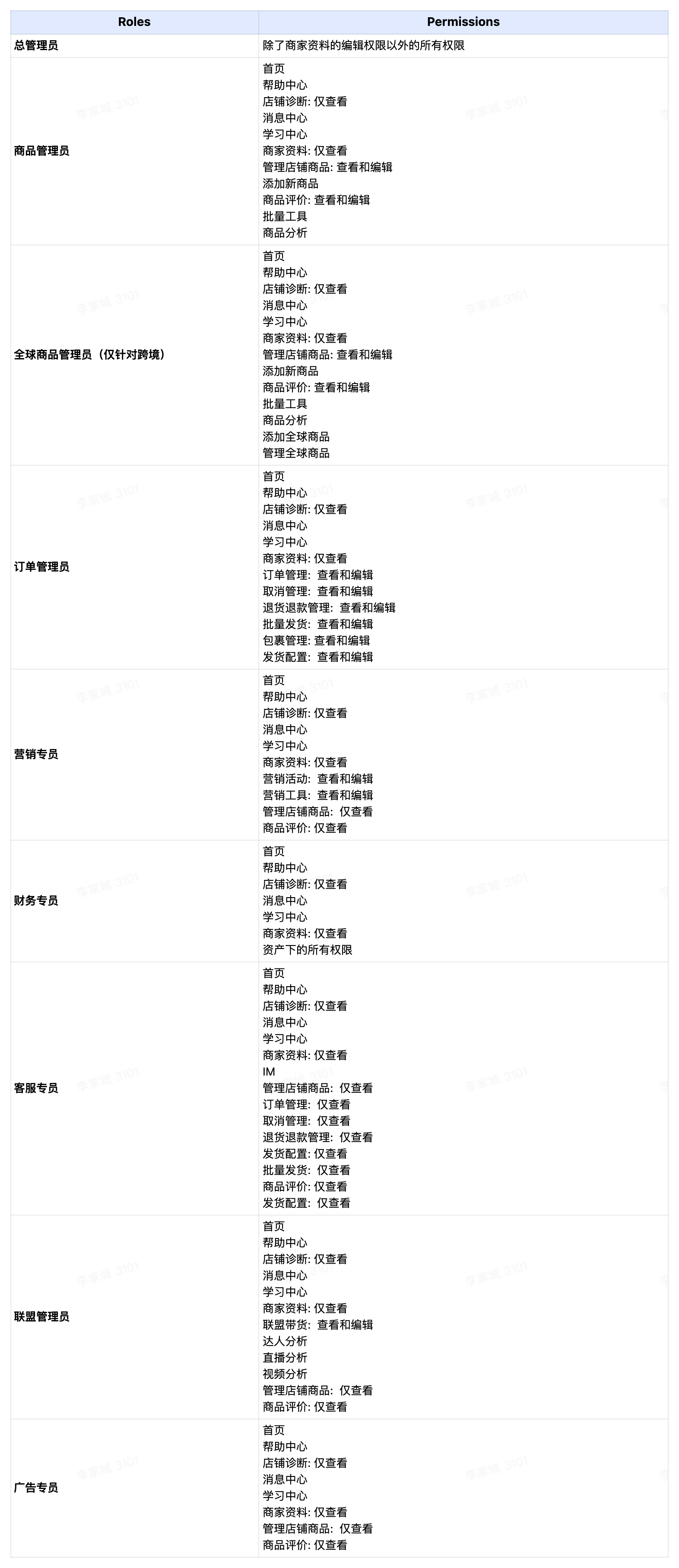 目前默认有以下九个角色,卖家可以在卖家中心-账户-用户管理-添加用户中找到最新的默认角色和权限。