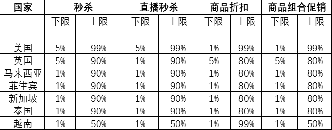 促销折扣门槛会使您在促销中将折扣设置的过高或者过低。允许折扣的大致范围为1-80%。不同的卖家促销工具具有不同的门槛,建议您在设置促销活动的折扣时在卖家中心进行查询,以确定折扣在允许的范围内。