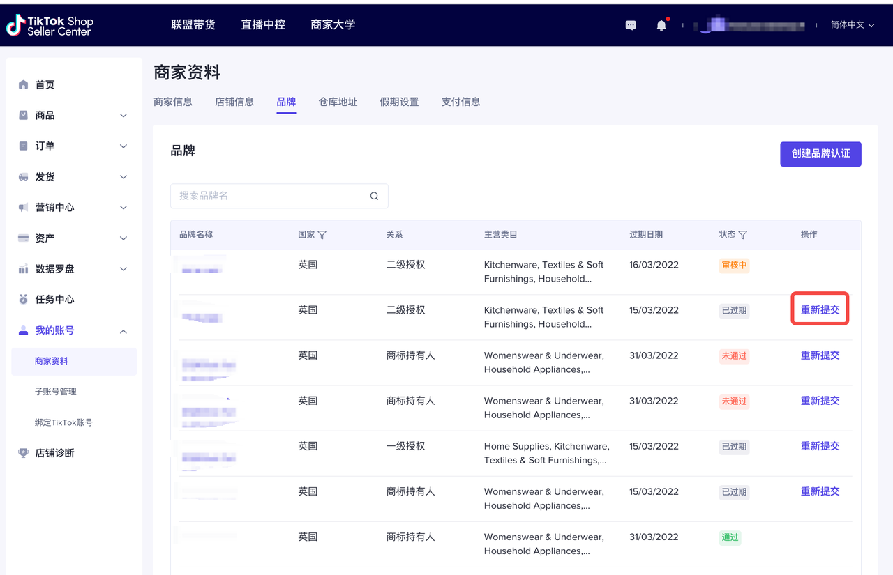 进入【商家中心】,点击【我的账号】>>【商家资料】,切换到【品牌】列表页,可以查看品牌认证的审核进度: