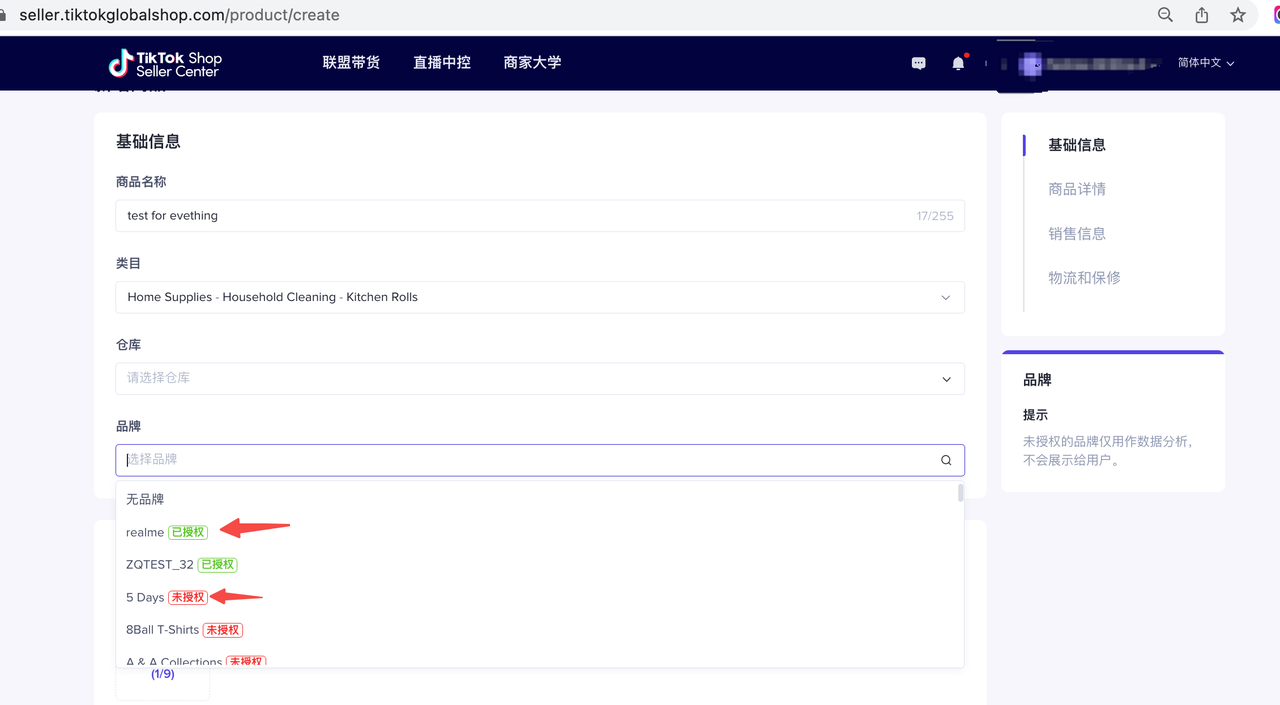 在新商品发布页面填写品牌信息,从下拉菜单页中选择品牌 (注:已授权的品牌名称会展示给用户,未授权的品牌仅用作数据分析,不会展示给用户)