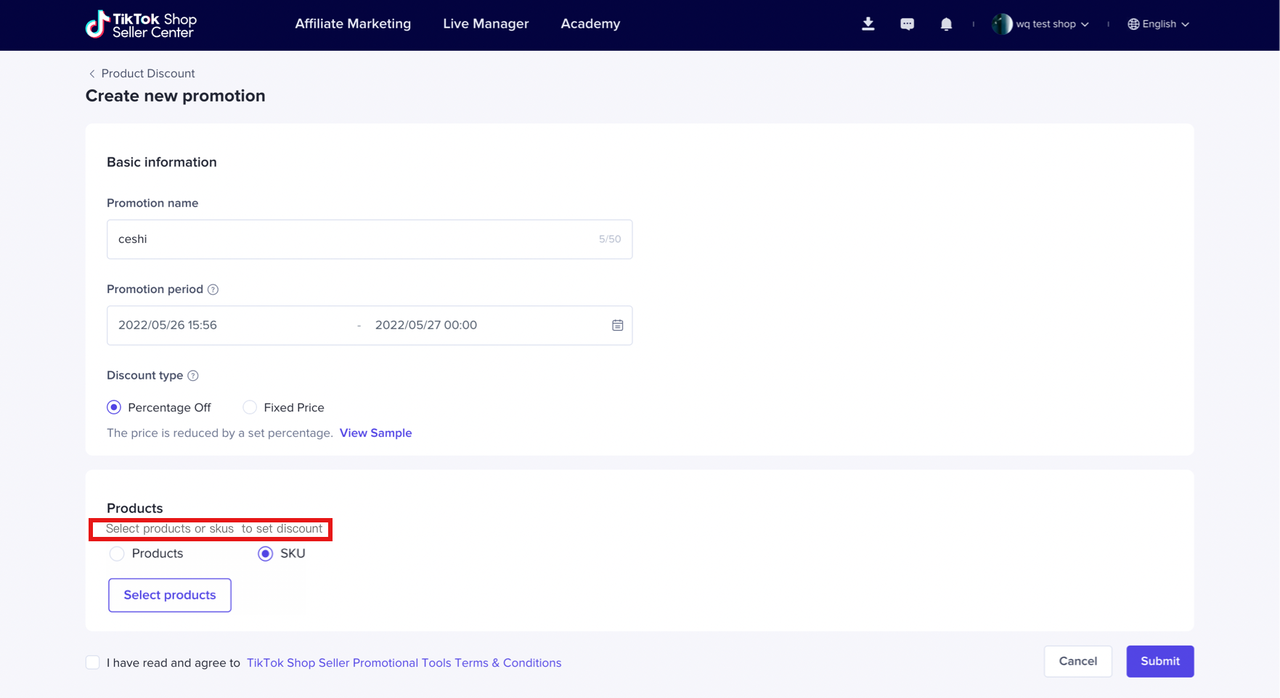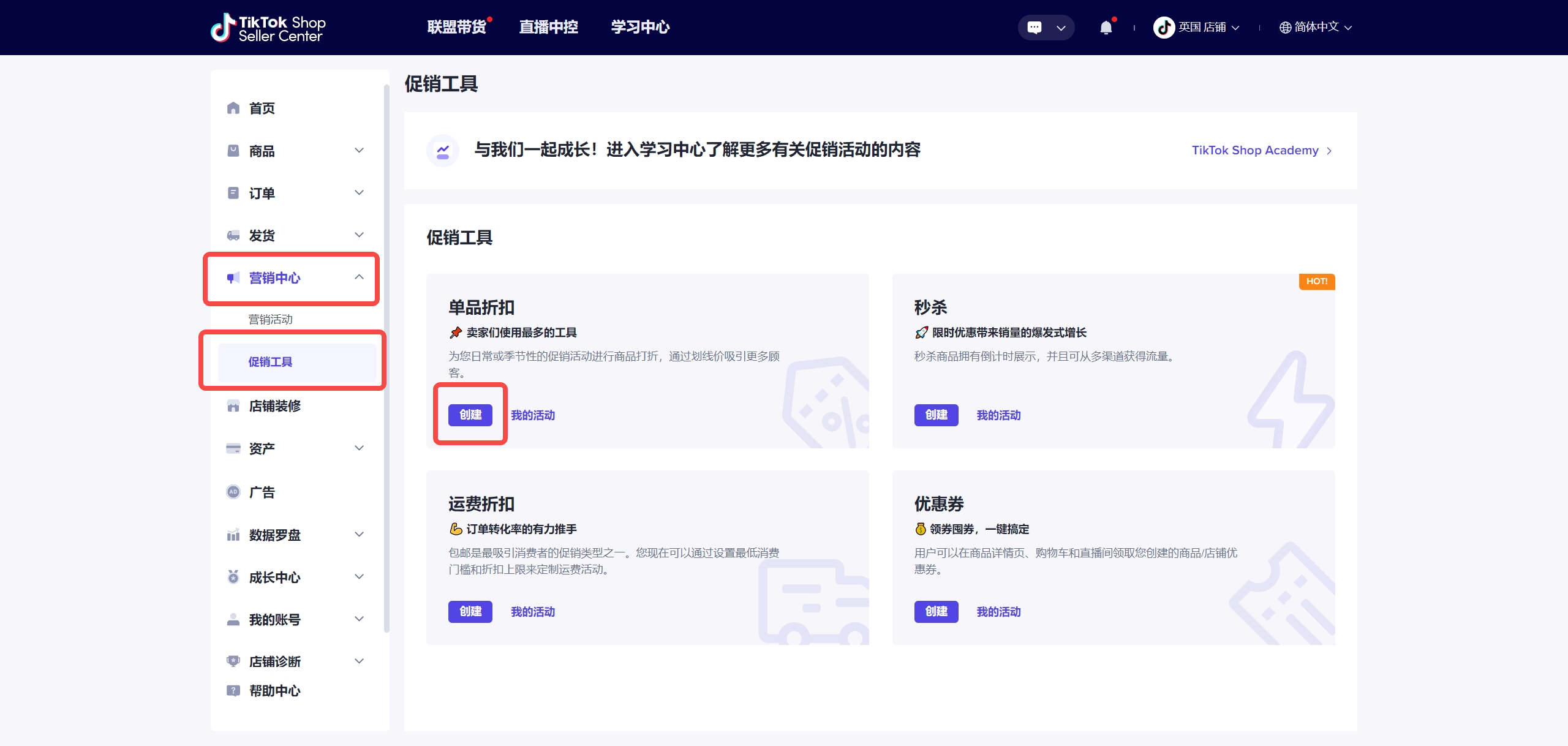 进入:商家中心->营销中心>促销工具->单品折扣->创建