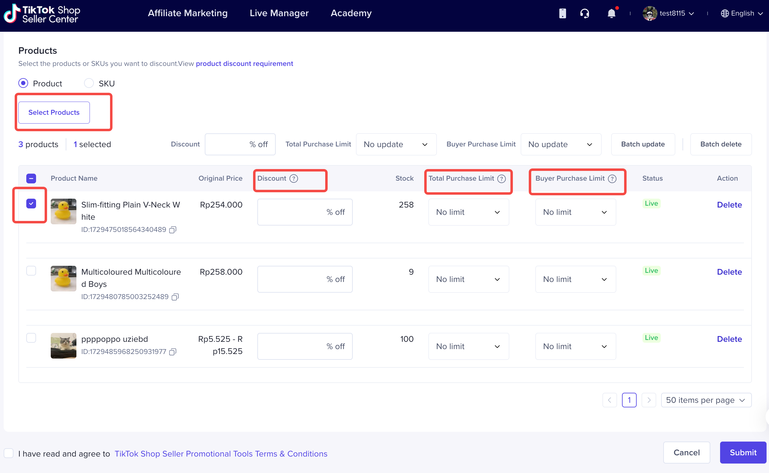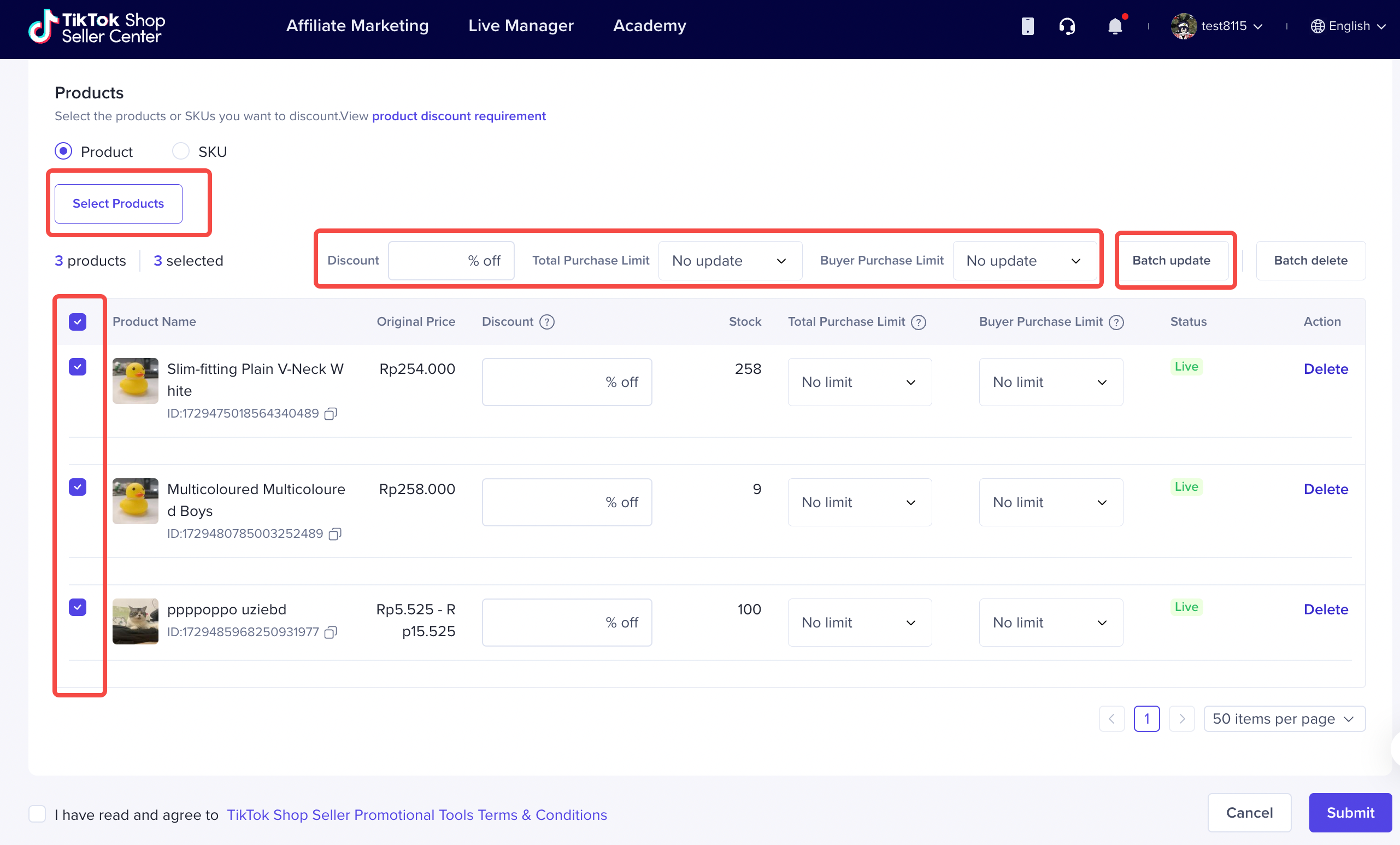 填写批量更新前方的“折扣详情”、“限购总量”及“单人限购量”信息后,勾选需要应用的商品,点击“提交”