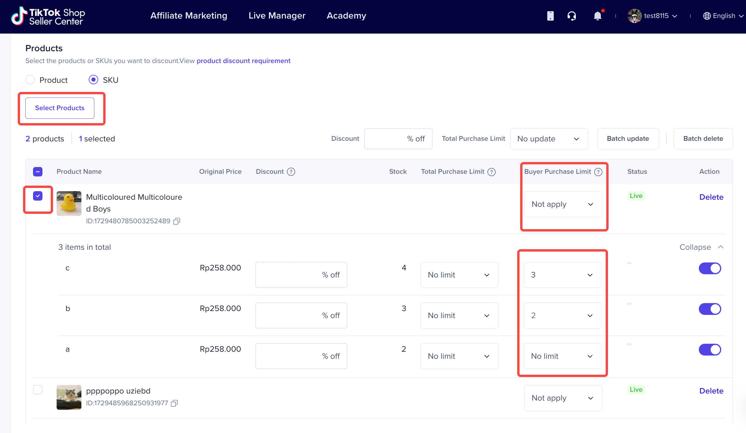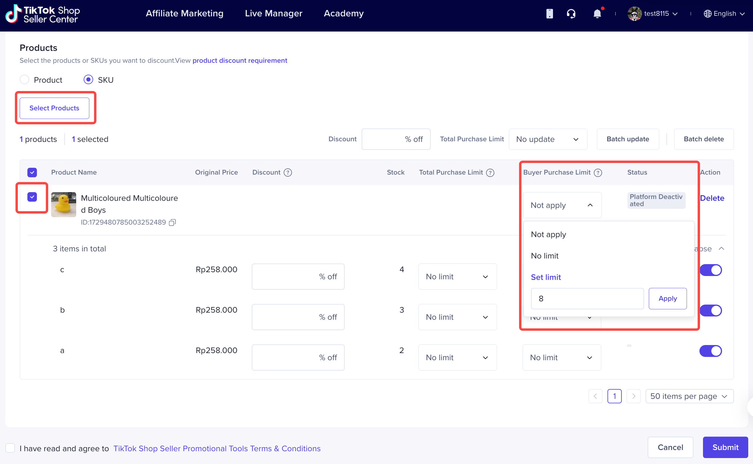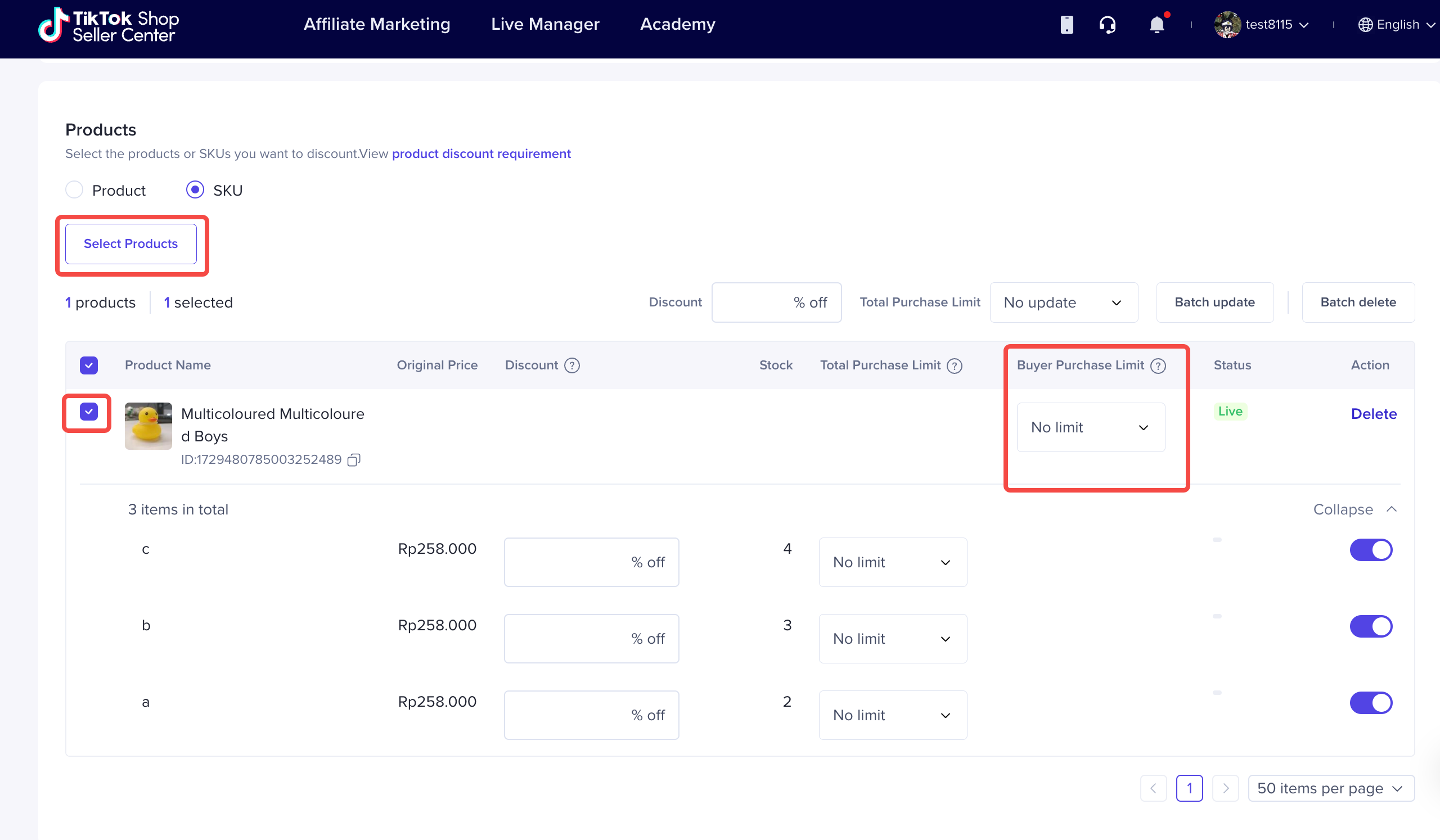 选择"No limit",表示不限制单个产品及单个SKU的单人限购量