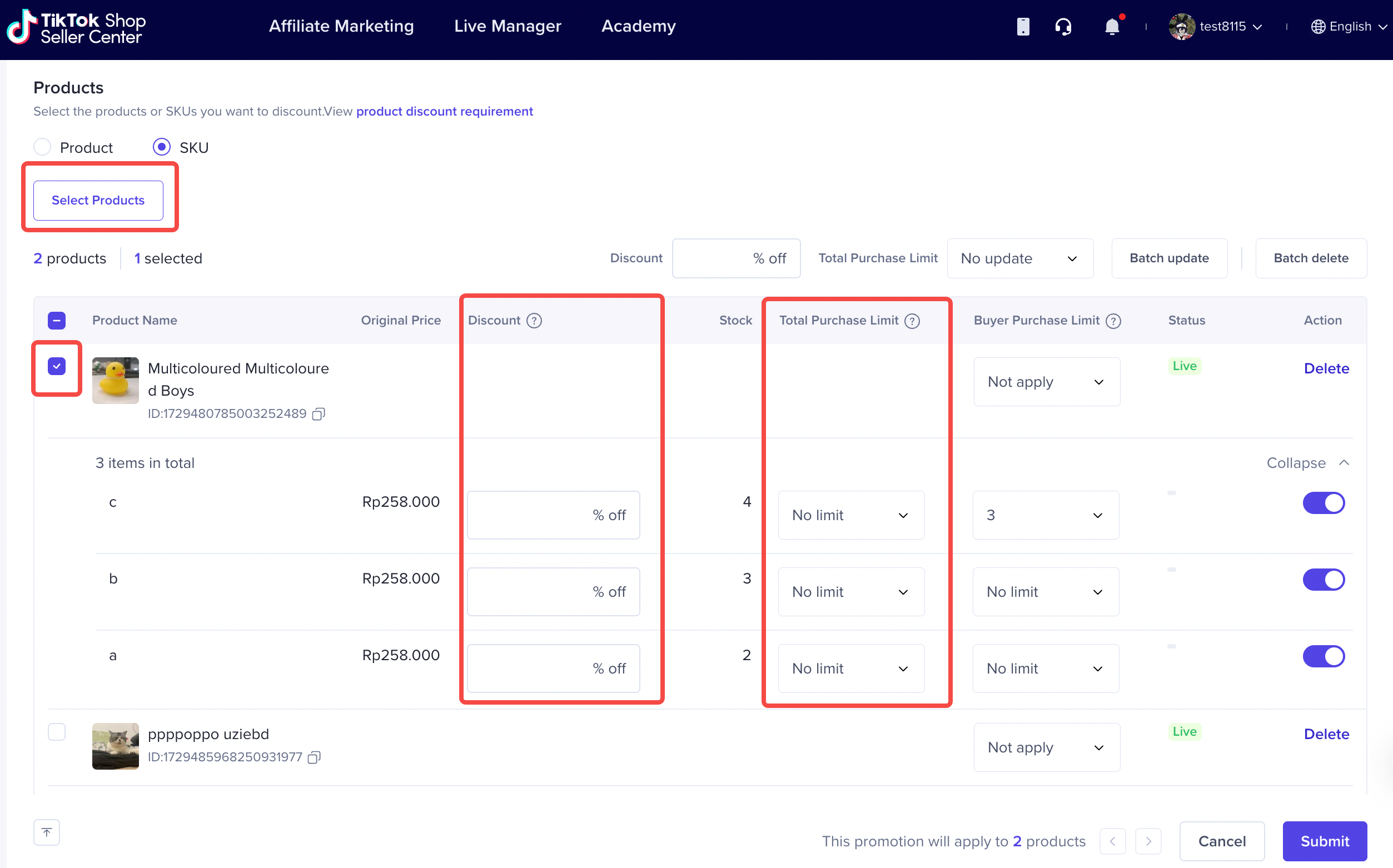设置“折扣详情”及“限购总量”:勾选需要应用的商品,在商品下面的每个SKU后设置相应的“折扣详情”及“限购总量”,设置完成后点击提交