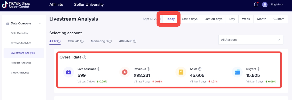 当选择【Today】查看今日数据时:展示今日时间段内店铺通过直播产生的成交、交易、转化数据;