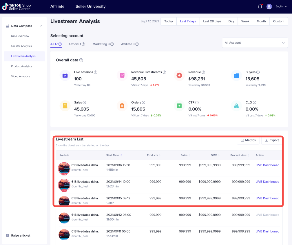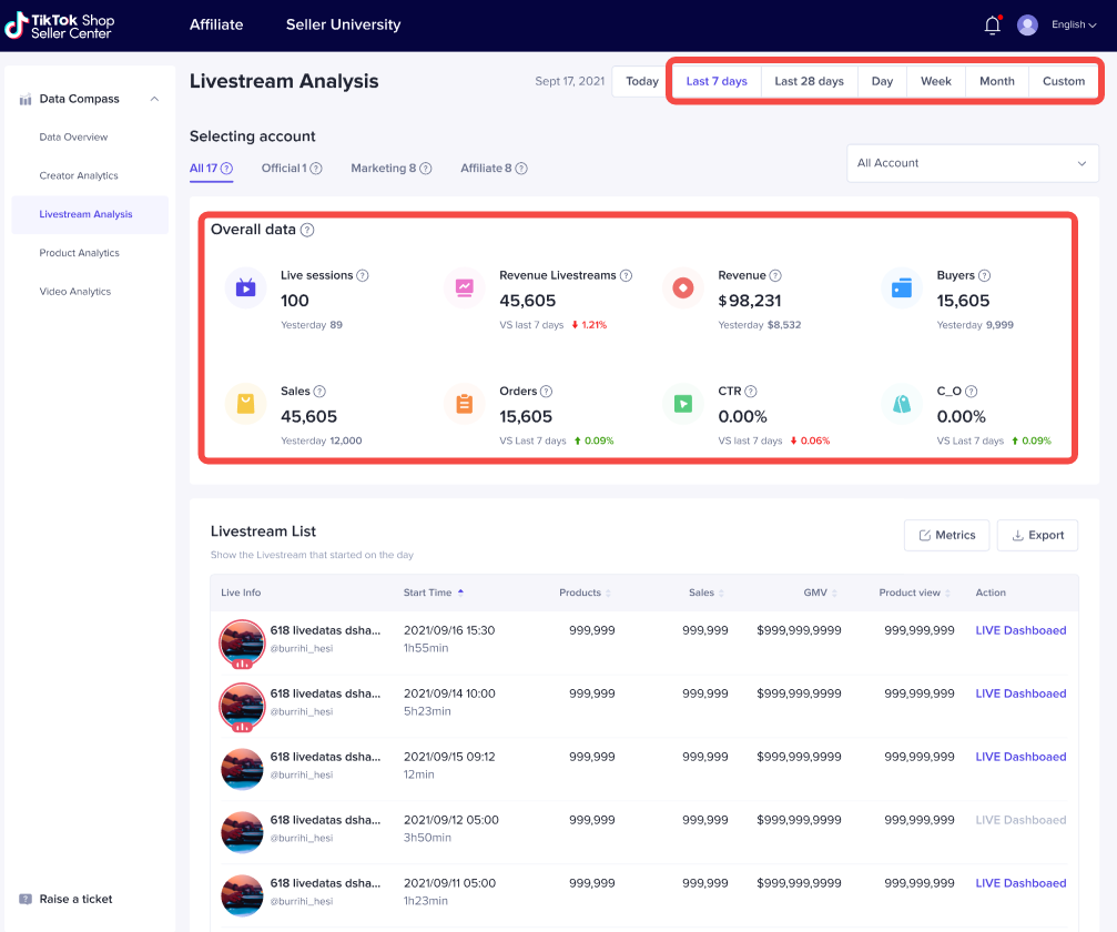 Buyers:The number of unique users who paid for orders made from livestreams. When you select the custom period