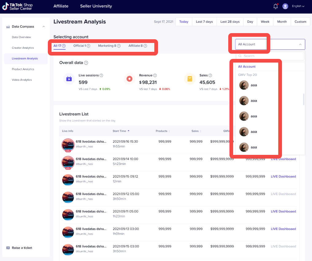 【1】支持按照【官方、渠道、联盟、全部】达人维度查看店铺在所选时间内的汇总直播数据和单场直播列表,例如: