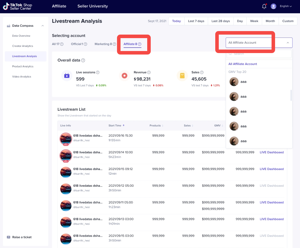 可查看合作的联盟达人和自身的官方账号在一段时间内和单场直播的表现。