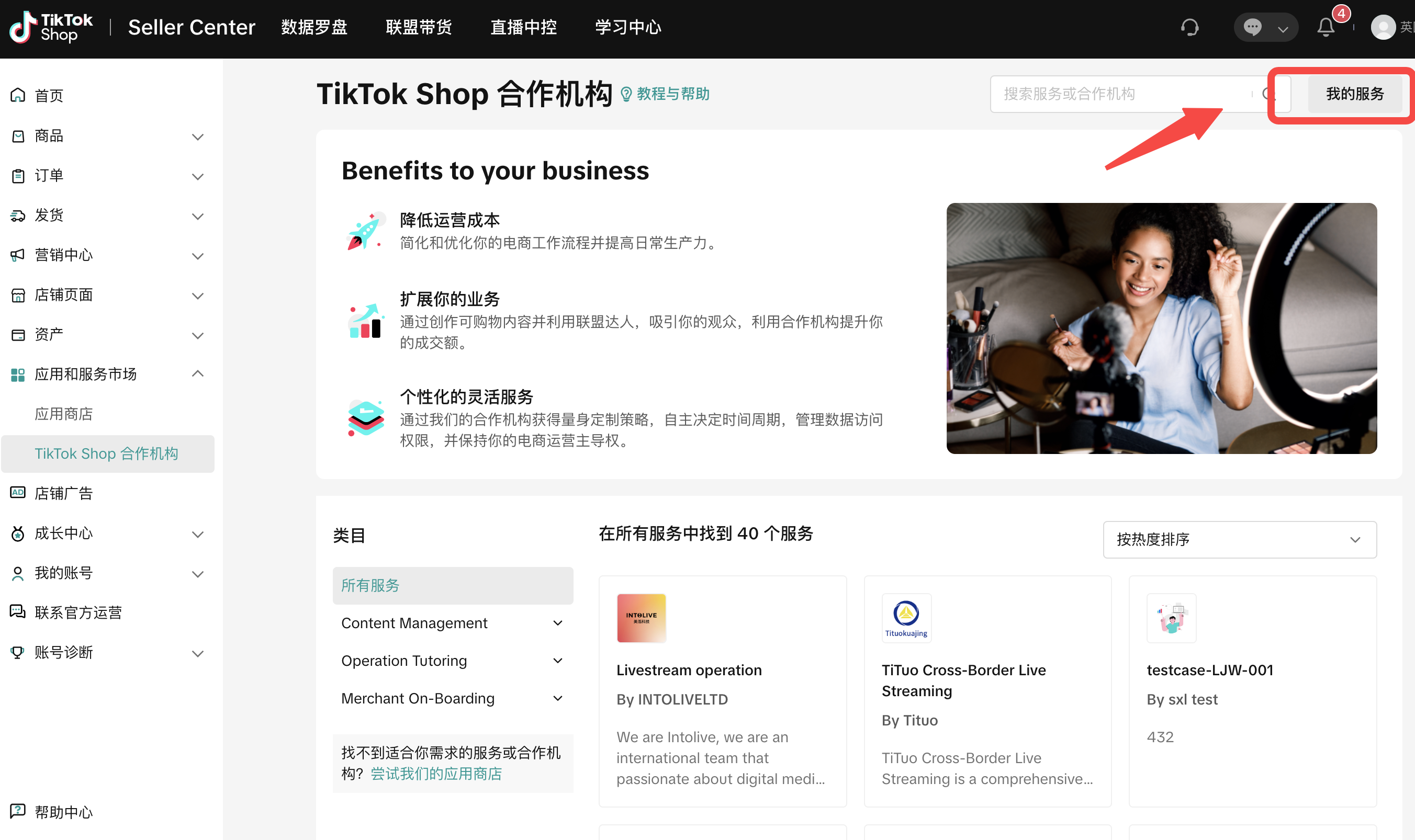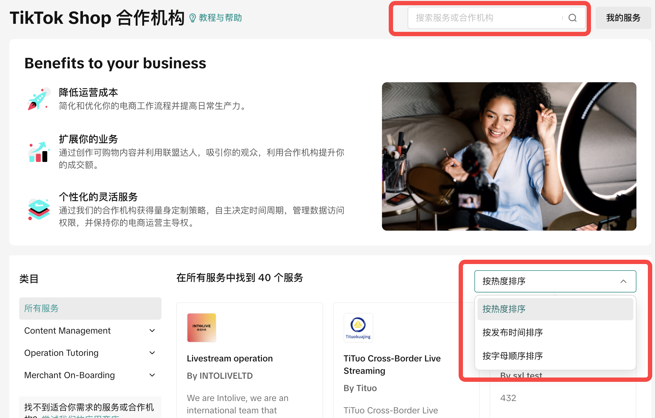 前往 卖家中心-- 应用和服务市场-- TikTok Shop 合作机构即可浏览TSP 服务, 您可以点击类目筛选对应服务,或使用排序、搜索快速找到您想要的服务。