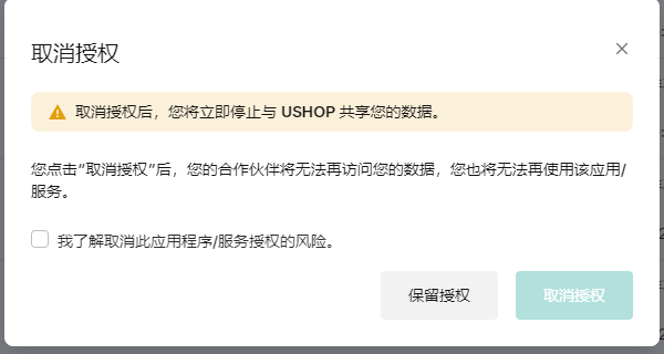 请注意:您点击“取消授权”后,您的合作伙伴将无法再访问您的数据,您也将无法再使用该应用/服务。