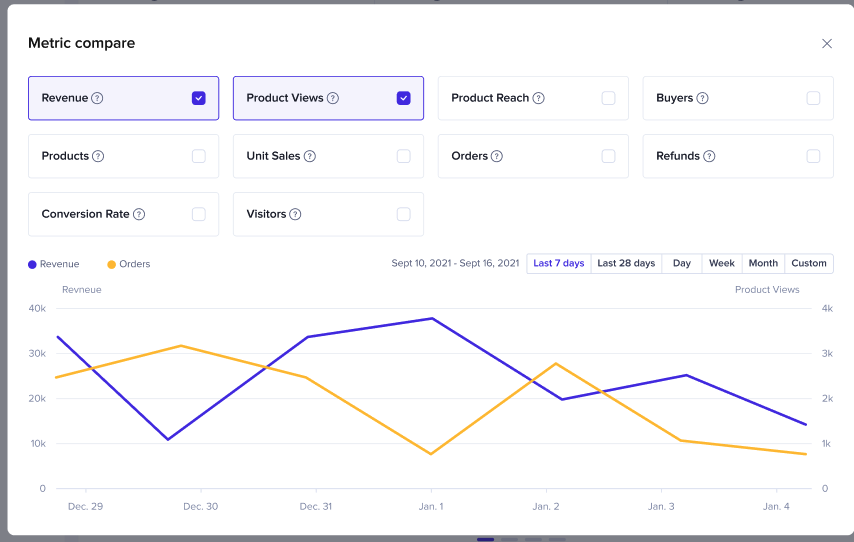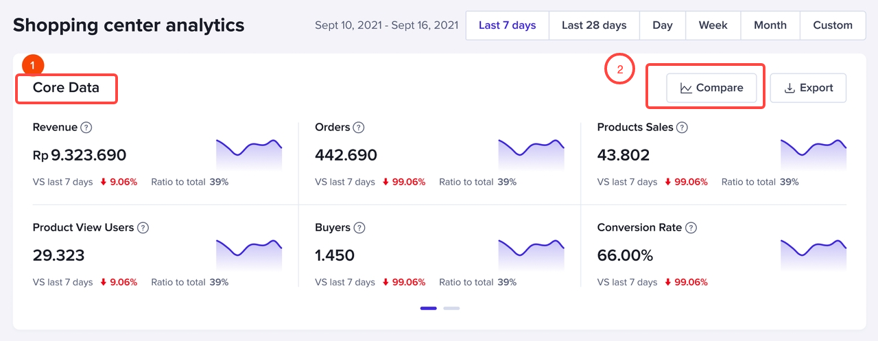 为了使数据波动趋势更加清晰,点击【对比】按钮,选择2个需要对比的指标,例如:商品曝光与曝光-点击转化率,可以对比这两个指标在所选周期内的变化趋势,了解商城商品是否抓住商城的流量机会,如果发现转化率/曝光下降,可以结合商品活动节奏、参加商场活动的商品变化、搜索优化等来定位原因。