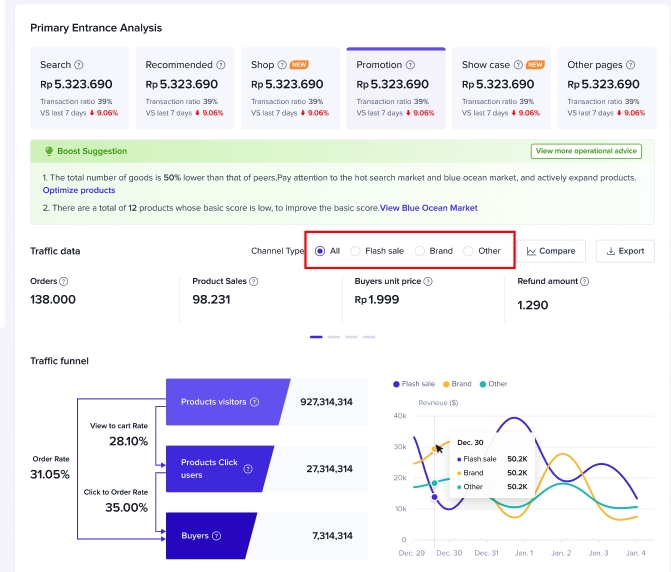 数据能力:查看不同渠道(搜索、商城推荐、店铺、活动频道、橱窗等渠道)的曝光、成交、加购、转化、退款表现和流量转化漏斗,了解从消费者看到商品、点击进入商品详情页、下单购卖,每一层漏斗的用户留存和流失率是多少。