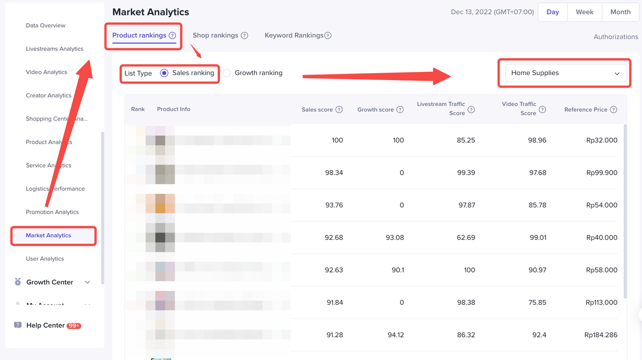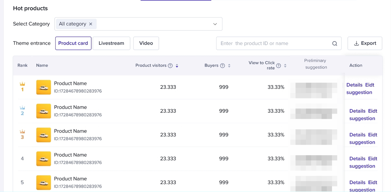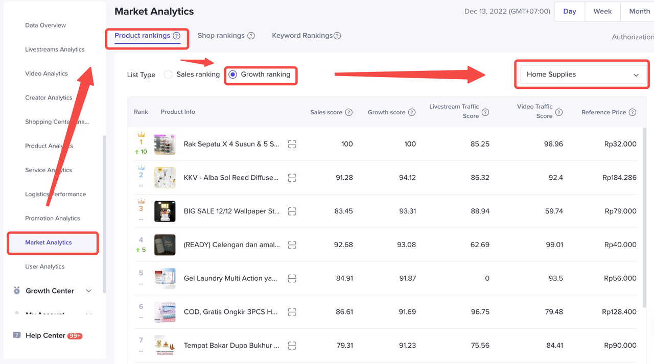 【ID】市场趋势选品:可以通过查看TTS平台上不同行业的热销商品和销售趋势上升的潜力商品,上传到TTS平台上,并获得更多曝光。