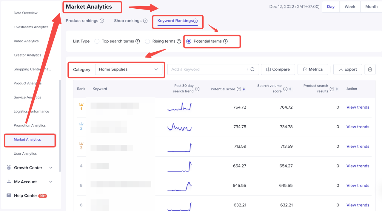 【ID】蓝海词:通过数据罗盘-市场分析-搜索词分析-蓝海词(Potential Terms)可以找到近期在平台搜索热度高,但商品供给少的搜索词,商家可以根据蓝海词挖掘相关商品,提前进入潜力市场,提升商品销量。