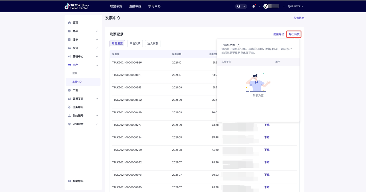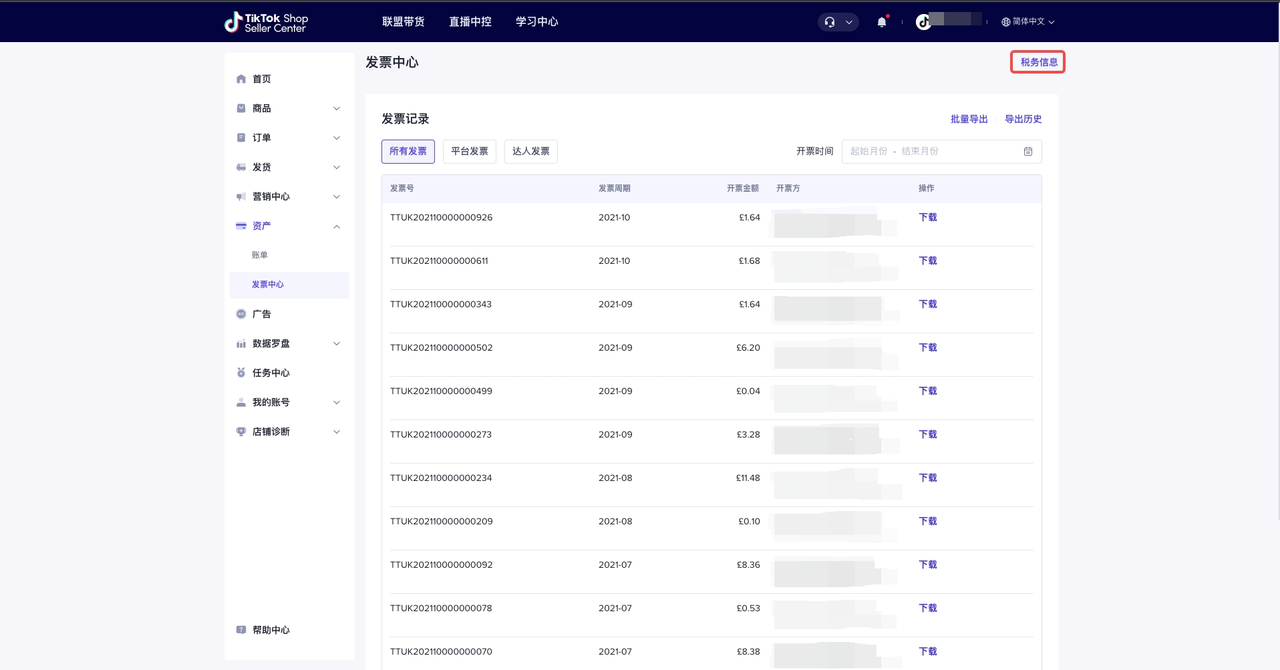 2.如果发现没有可下载的发票,商家需要先在店铺信息-税务信息中完善店铺的税务信息。发票会在填写完成的下月1日提供下载。