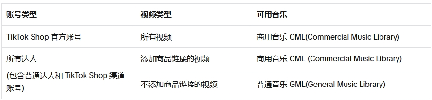 与TikTok Shop关联的官方账号渠道账号在发布添加商品链接的视频时,只能选择商用音乐中的歌曲。