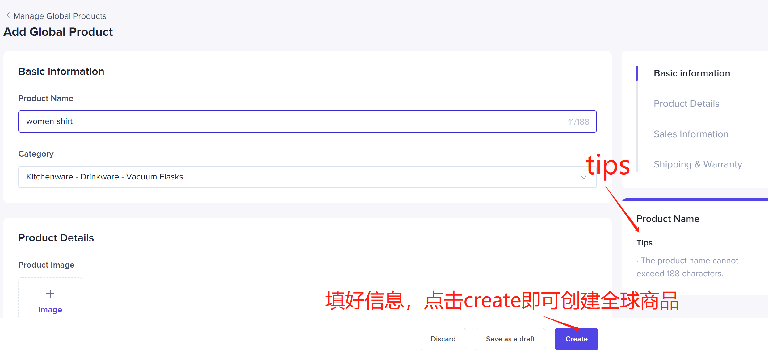 每个字段的填写要求,在右侧的tips中有说明,按规范填写后,点击“create”(创建)按钮即可创建全球商品。点击存为“Save as a Draft”则存为草稿,之后可以再次编辑。