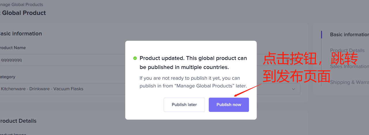 方法一:创建全球,或者更新还未发布的全球商品时,系统会有弹窗提示可以将全球商品发布到店铺;