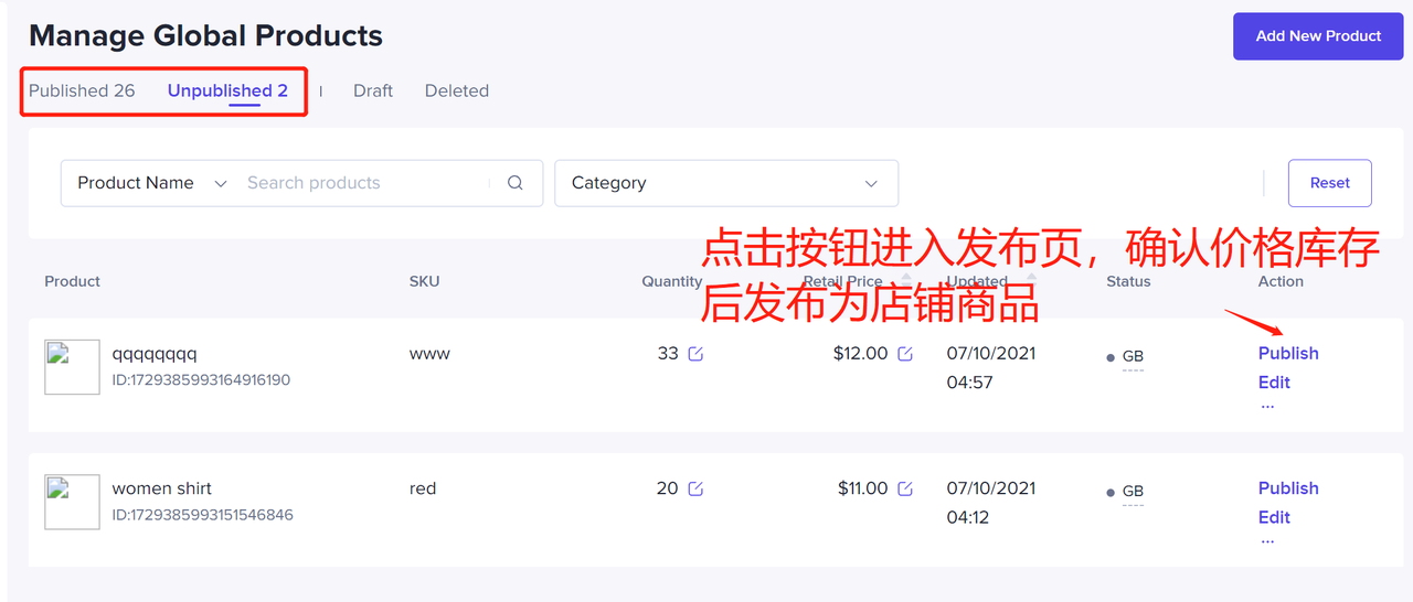 “unpublished”(未发布):指已经创建,但是还从未发布到店铺的全球商品;