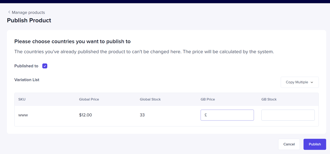 商家可以通过全球商品和店铺商品两层来管理商品,例如,先上传一个全球商品,然后想在英国和法国销售商品,可以将商品发布到英国和法国,此时英国和法国的店铺就会出现这个商品。