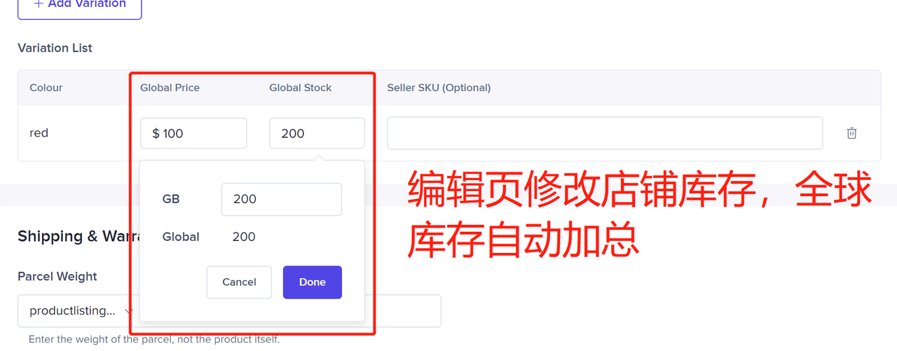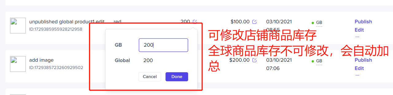 库存:全球商品的库存是所有店铺商品库存的总和,在全球商品发布到店铺时,需要确认店铺的库存,修改店铺库存之后,全球商品库存自动改变;