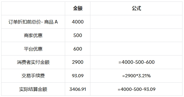 公式:交易手续费=(订单折扣前总价-商家优惠-平台优惠-消费者退款)*3.21%