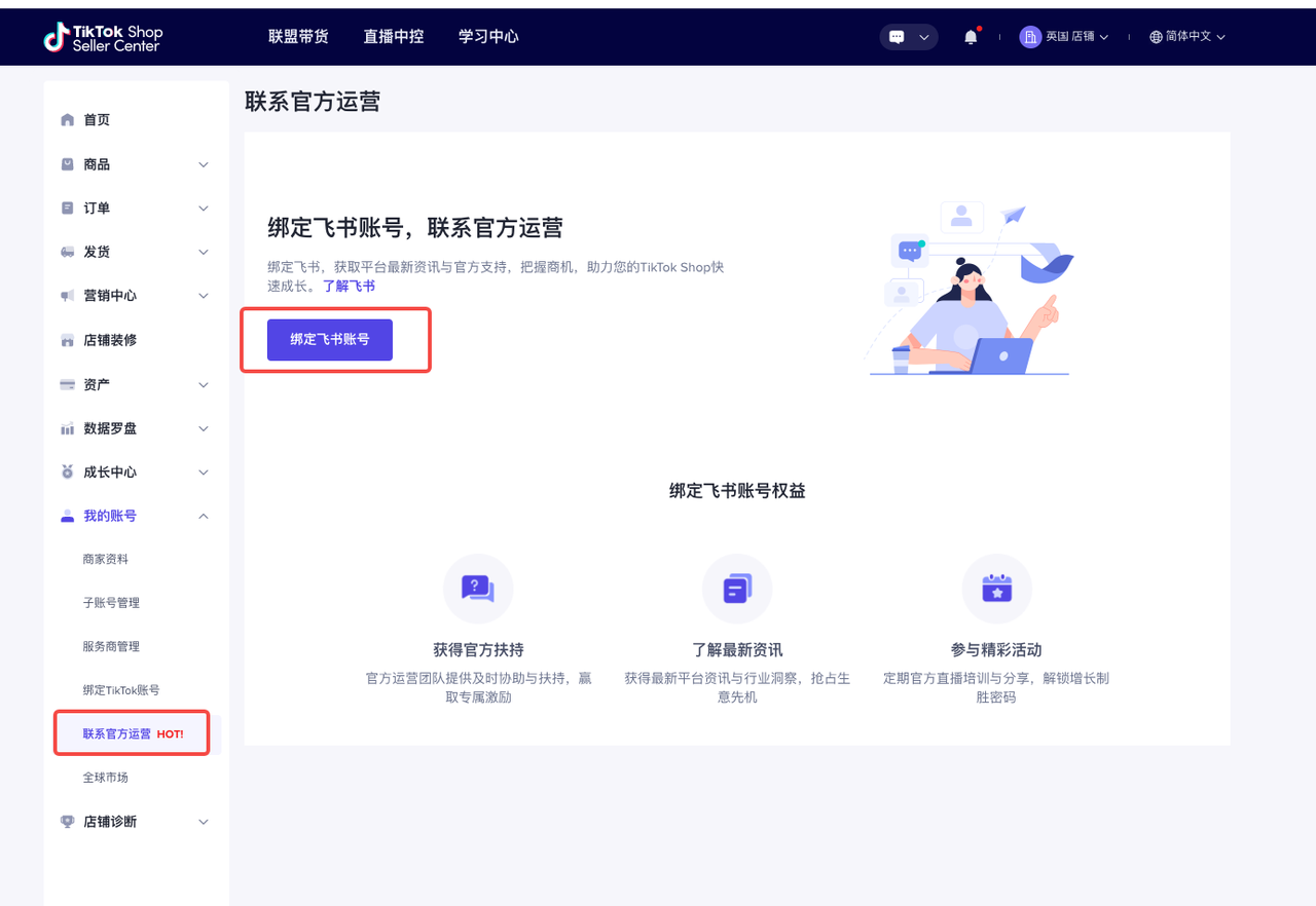 登录TikTok店铺后台,左侧导航栏选择“我的账号>联系官方运营”,右侧页面点击“绑定飞书账号”。