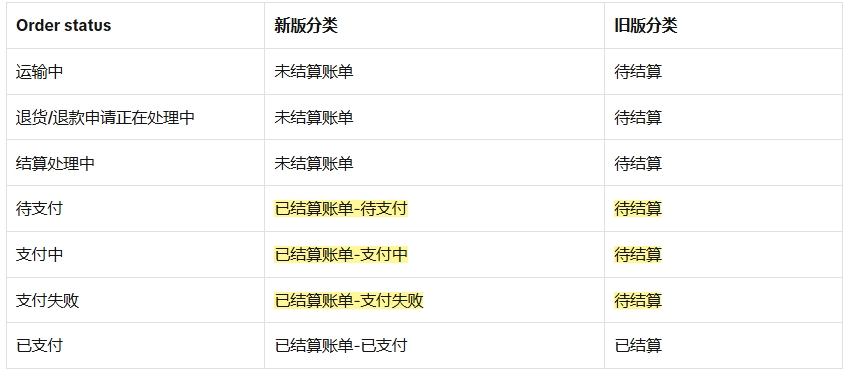 在新版的订单结算账单中,“运输中”、“退货/退款申请正在处理中”或“结算处理中”的订单都将被归类在“未结算账单”中进行展示;同时已经支付或正在支付的订单将被归类在“已结算报表”中进行展示