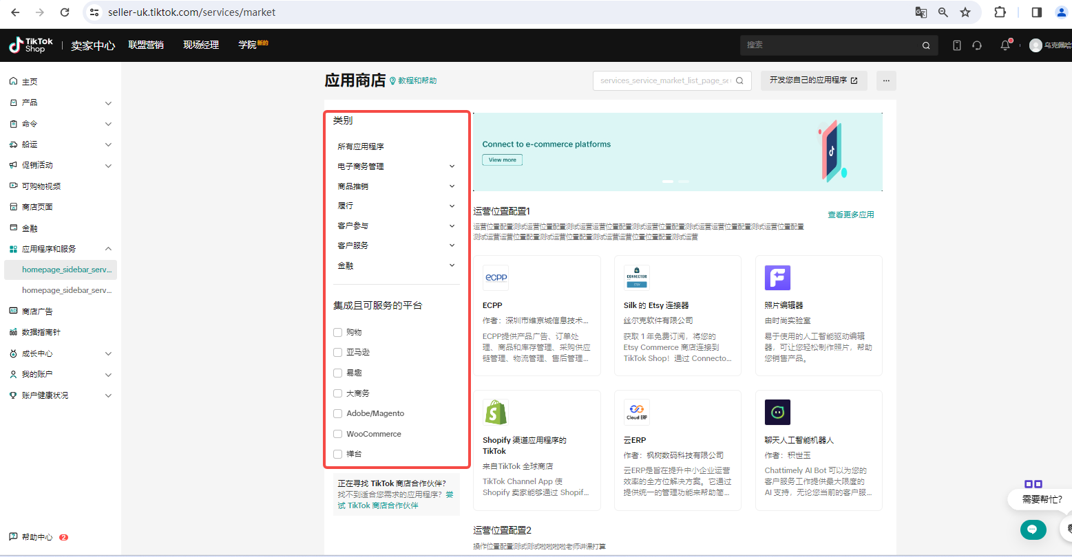 前往【卖家中心】>【应用市场】。 您可以通过筛选类别和集成平台浏览应用市场上的应用。