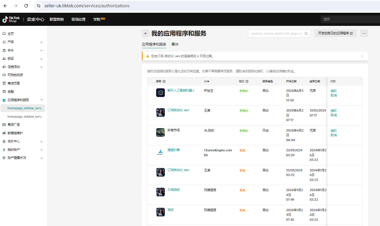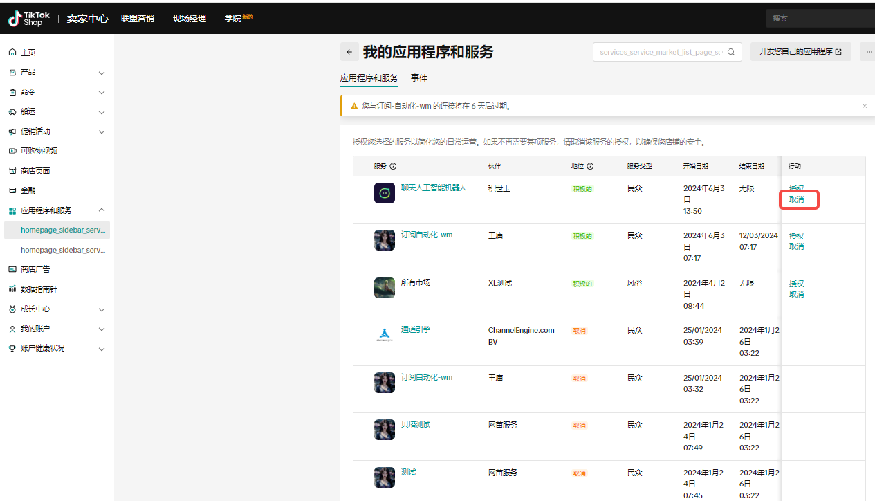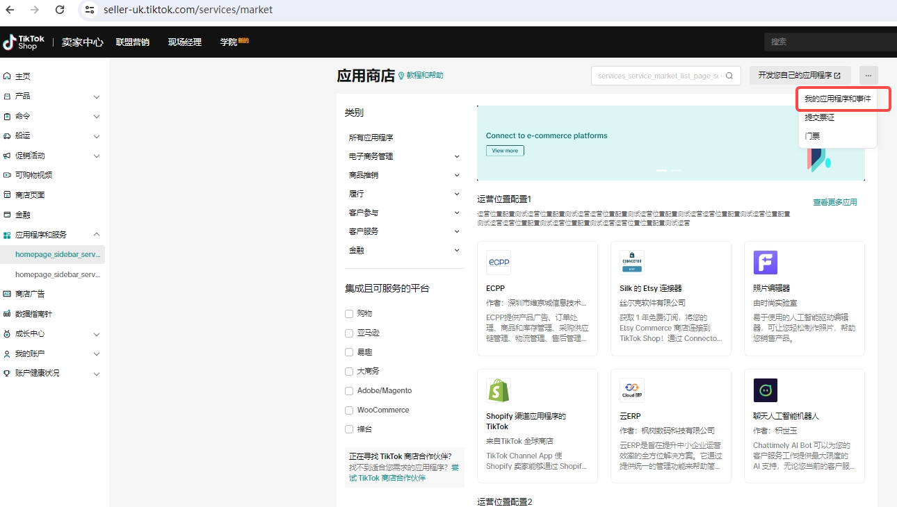 您可以前往[卖家中心]>[应用市场]>[我的应用程序和事件]查看和管理您的所有应用。